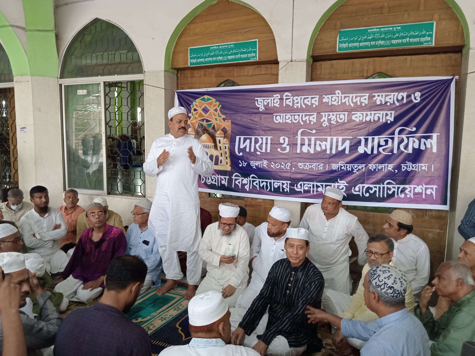 চট্টগ্রাম বিশ্ববিদ্যালয়ের প্রাক্তন শিক্ষার্থীদের সংগঠন চট্টগ্রাম বিশ্ববিদ্যালয় এলামনাই এসোসিয়েশন-এর উদ্যোগে জুলাই-আগস্ট গণআন্দোলনে শহীদদের স্মরণে এবং আহতদের দ্রুত সুস্থতা কামনায় এক দোয়া ও মিলাদ মাহফিল অনুষ্ঠিত হয়েছে।