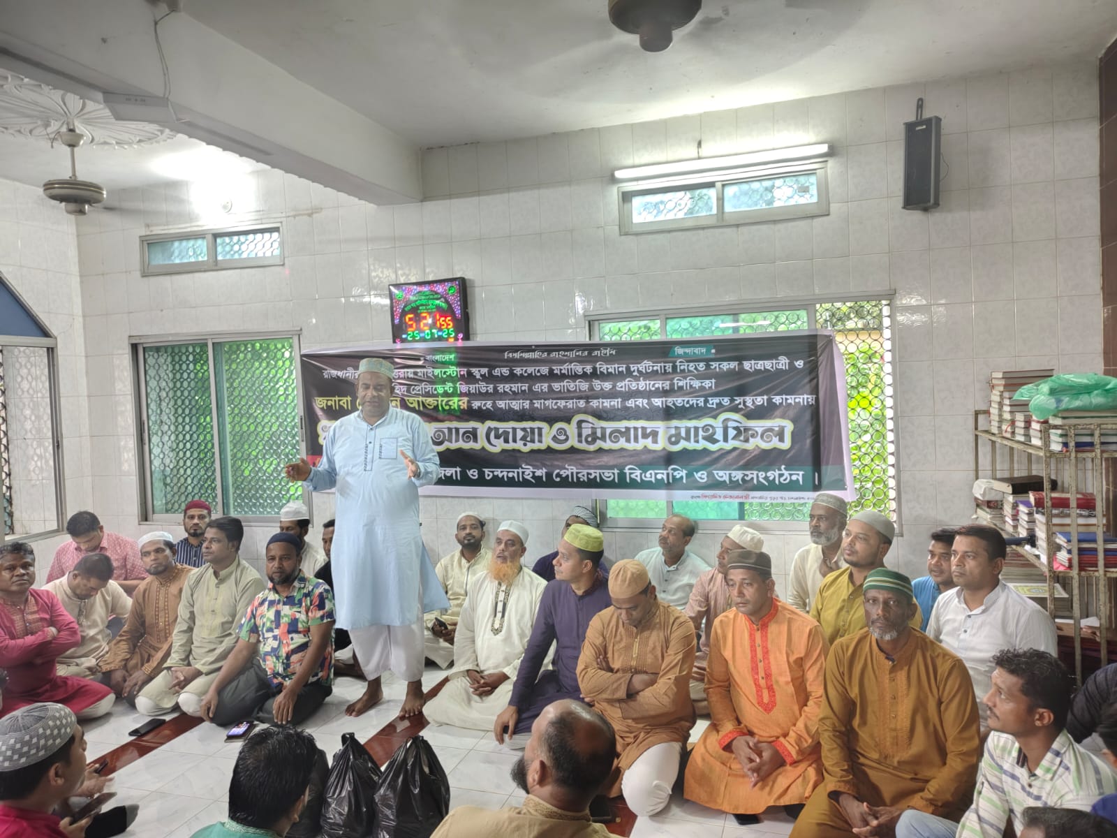 ঢাকার উত্তরায় মাইলস্টোন স্কুল অ্যান্ড কলেজে বিমান বাহিনীর একটি প্রশিক্ষণ বিমান বিধ্বস্ত হয়ে প্রাণহানির ঘটনায় নিহতদের আত্মার মাগফিরাত এবং আহতদের সুস্থতা কামনায় মিলাদ ও দোয়া মাহফিল অনুষ্ঠিত হয়েছে।