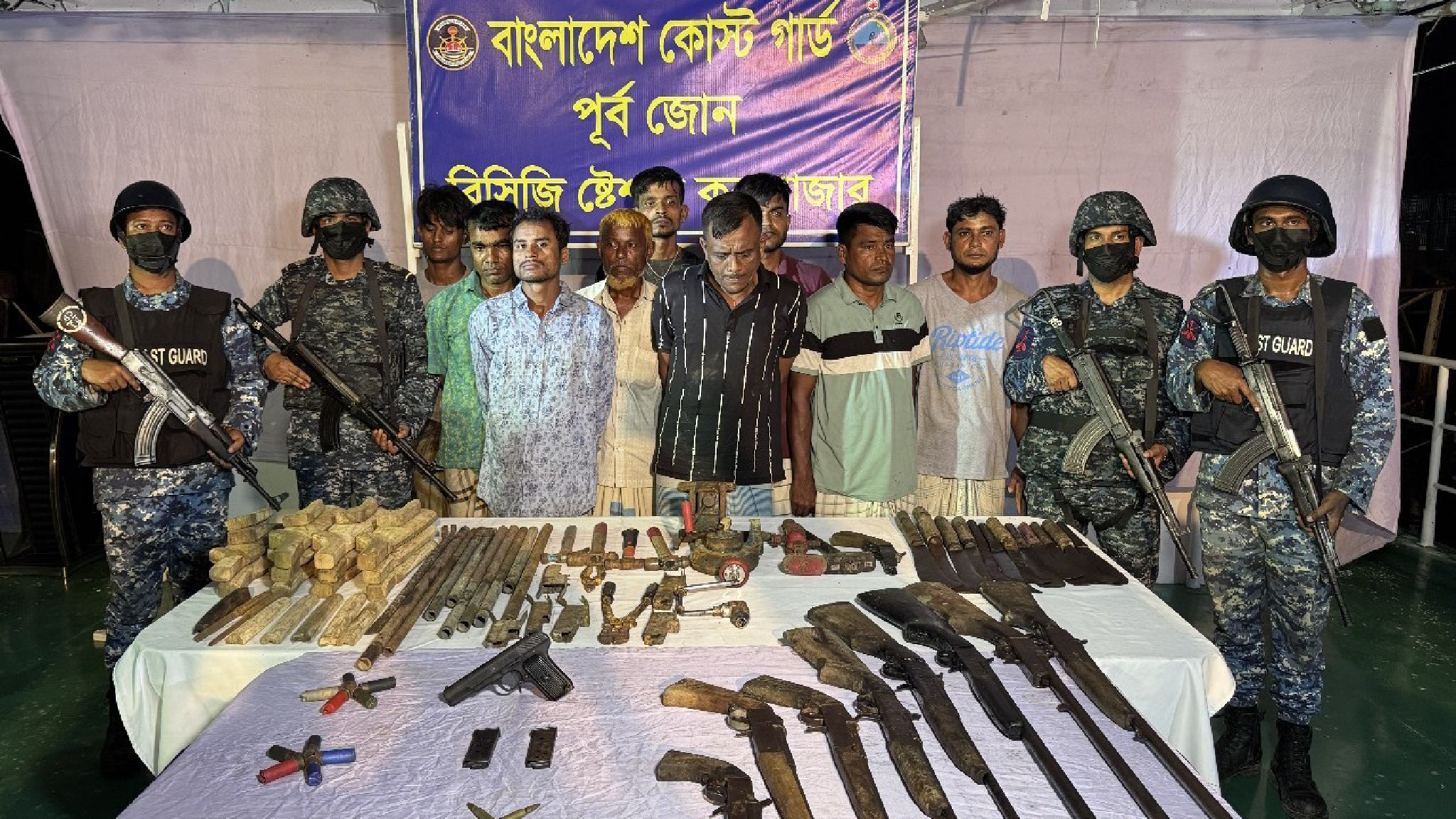 কক্সবাজারের মহেশখালীতে কোস্ট গার্ড ও নৌবাহিনীর যৌথ অভিযানে বিপুল পরিমাণ অস্ত্র, গোলাবারুদ ও অস্ত্র তৈরির সরঞ্জামসহ কুখ্যাত ‘জিয়া বাহিনীর’ ৯ জন সক্রিয় সদস্যকে আটক করা হয়েছে।