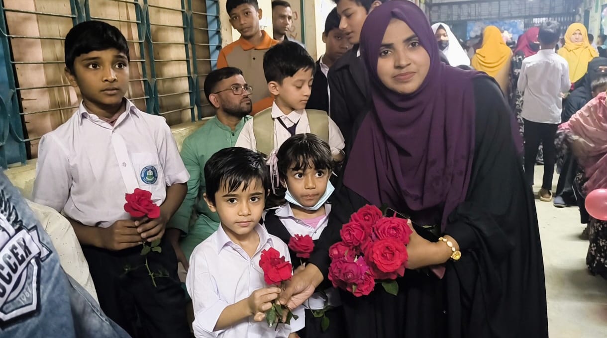 অনুষ্ঠানের এক আনন্দঘন পর্বে শিক্ষকদের পক্ষ থেকে নবীন শিক্ষার্থীদের হাতে লাল গোলাপ ফুল তুলে দিয়ে উষ্ণ শুভেচ্ছা ও অভিনন্দন জানানো হয়, যা পুরো অনুষ্ঠানকে আরও প্রাণবন্ত করে তোলে।