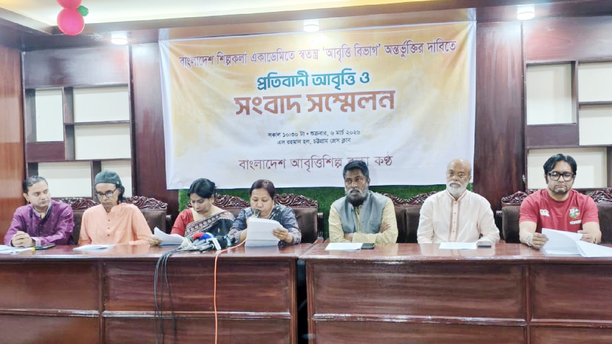 শুক্রবার (৬ মার্চ) সকাল সাড়ে ১০টায় চট্টগ্রাম প্রেস ক্লাবের এস রহমান হলে ‘বাংলাদেশ আবৃত্তিশিল্প রক্ষা কণ্ঠ সংগঠনের’ ব্যানারে শিল্পকলা একাডেমিতে স্বতন্ত্র 'আবৃত্তি বিভাগ' অর্ন্তভূক্তির দাবীতে প্রতিবাদী আবৃত্তি ও সংবাদ সম্মেলন করেন আবৃত্তিশিল্পীরা।