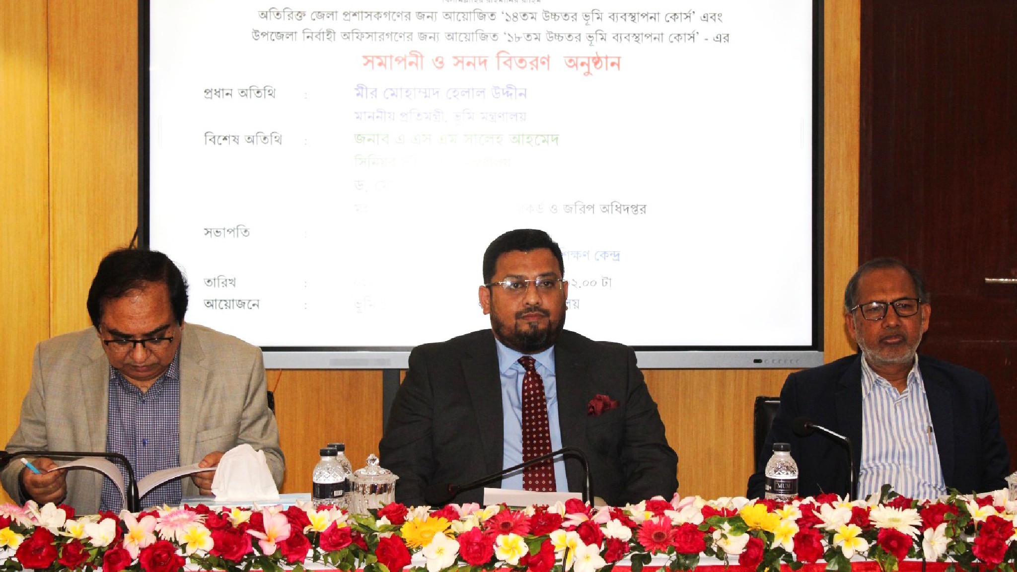 ভূমি প্রশাসন প্রশিক্ষণ কেন্দ্রের পরিচালক (যুগ্মসচিব) মোহাম্মদ আবুল খায়েরের সভাপতিত্বে অনুষ্ঠানে বিশেষ অতিথি হিসেবে উপস্থিত ছিলেন ভূমি মন্ত্রণালয়ের সিনিয়র সচিব এ এস এম সালেহ আহমেদ এবং ভূমি রেকর্ড ও জরিপ অধিদপ্তরের মহাপরিচালক (গ্রেড-১) ড. মো. মাহমুদ হাসান। অনুষ্ঠানে স্বাগত বক্তব্য দেন কোর্স পরিচালক খান এ. সবুর খান।